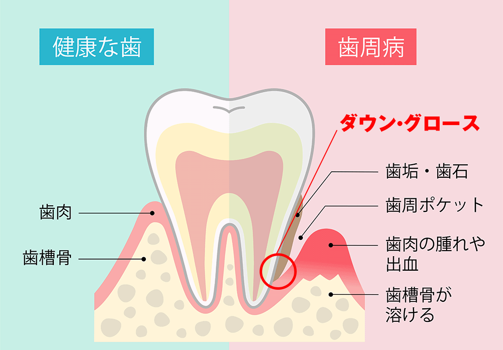 歯周病は健康なピンク色で引き締まった歯ぐきが、血色が悪くなったり歯磨きをすると出血をするような状態から始まります。昔、「リンゴを食べると血が出ませんか?」というコマーシャルが歯槽膿漏(歯周病が進行した状態の総称)というキーワードを一気に有名にさせました。