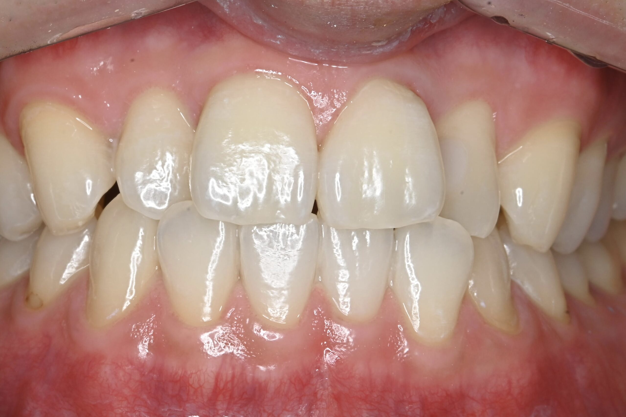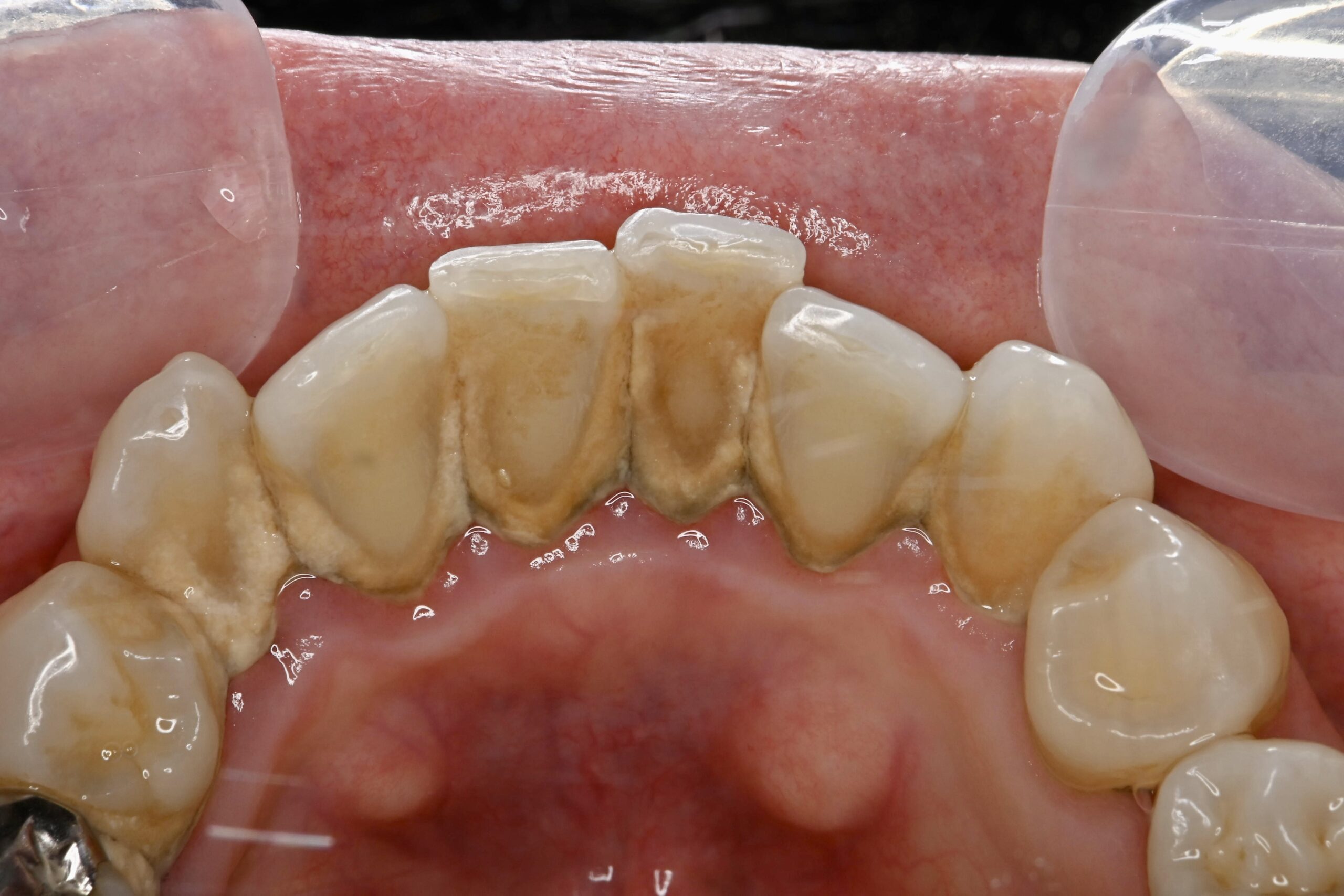 | 治療内容 | 精密検査を行った結果、歯周ポケット(歯と歯茎の間の溝)の深さが4 mm以上の部位が全体の72%以上で、最大10 mmであった。またエックス線画像からは歯槽骨(歯を支える骨)の著しい(歯の根の1/3~2/3程度)吸収を確認した。重度慢性歯周炎(ステージⅢ グレードC)と診断し、歯周治療を開始した。 歯周基本治療として徹底したブラッシング指導と歯肉縁上スケーリング並びに6ブロックに分けた歯肉縁下歯石の除去を行った。再評価検査の結果、病状安定と判断できる歯周組織の状態となったためため歯周外科治療は行なわずにメインテナンスへ移行した。 |
